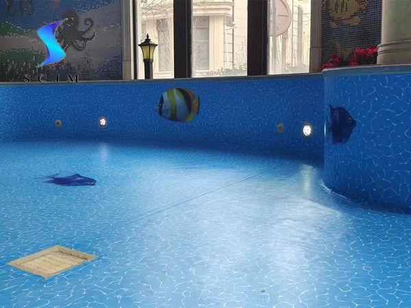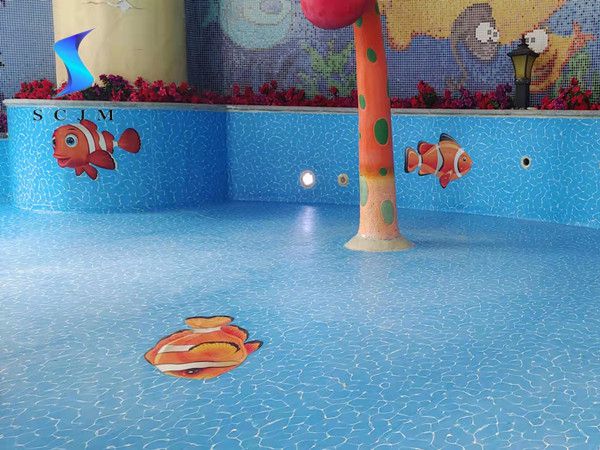 本項目位于北京市,為室內(nèi)戲水池,原基礎(chǔ)為馬賽克瓷磚,裝修改造更換泳池膠膜,表面附有海洋生物圖案膠膜,整體效果如下:
